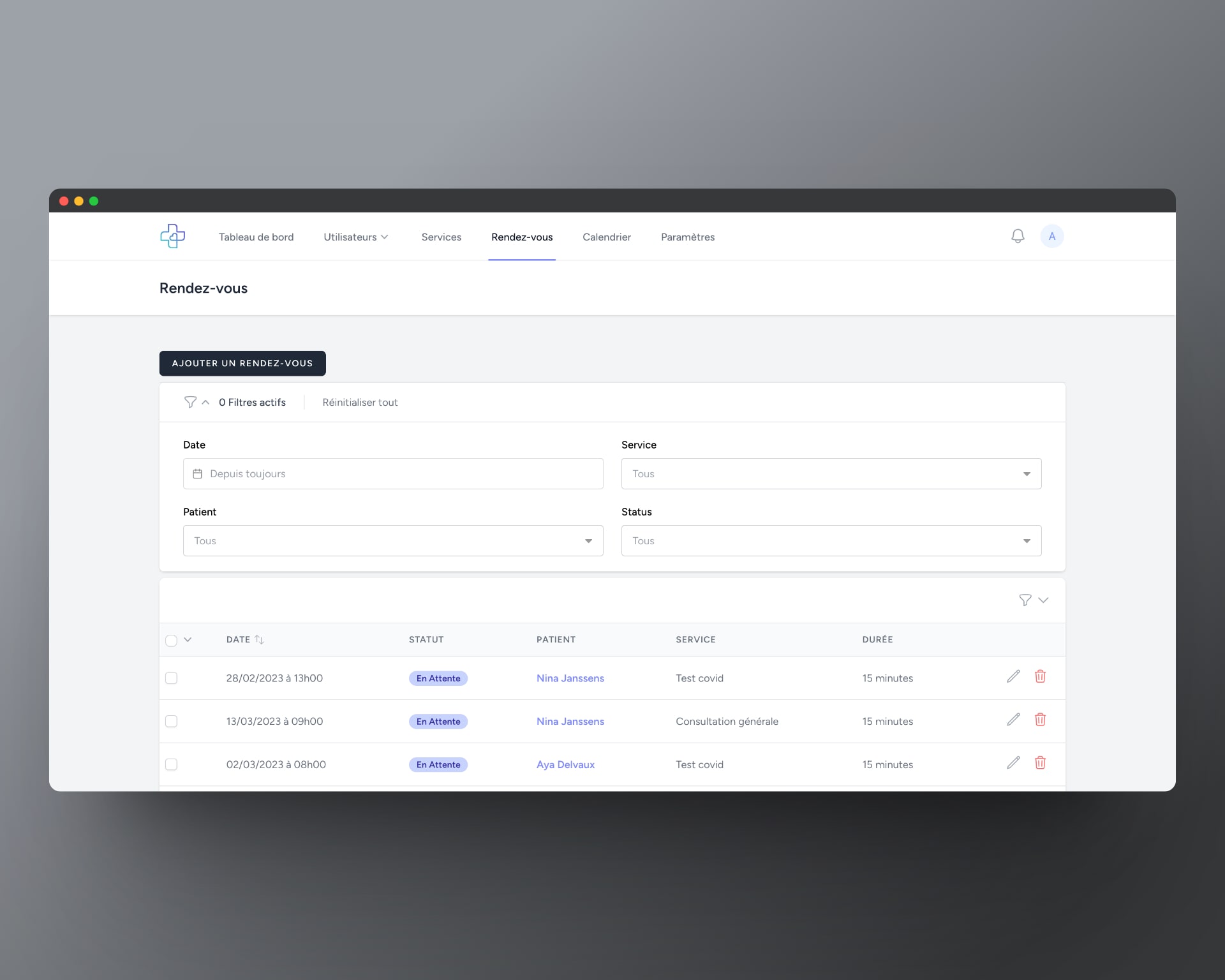 Back office permettant la gestion des rendez-vous, du personnel, des agendas aini que la gestion des paiements, etc.